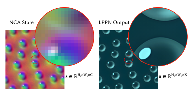 * 细节:NCA 实际上是在一个粗糙的 $128 \times 128$ 格子上演化的。然而,通过 LPPN,模型可以渲染出 $1024 \times 1024$ 的 RGB 图像。