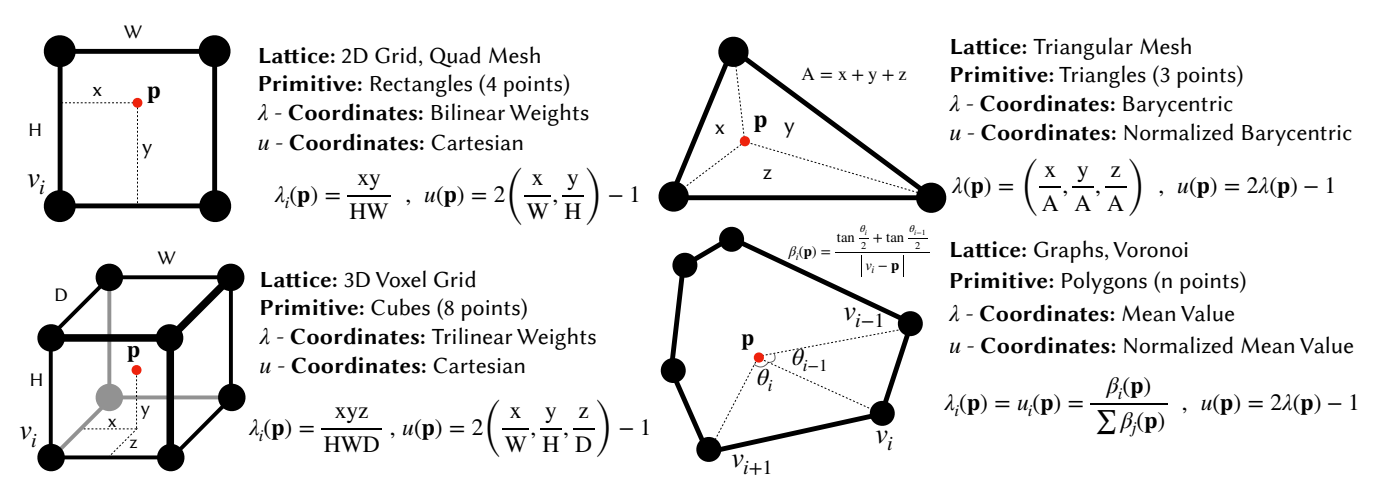 - 三角形/多边形图元(mesh):保留 $\lambda(\mathbf{p})$(例如三角形的重心坐标)作为 $u(\mathbf{p})$。