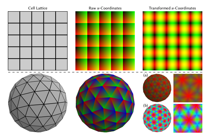 - 排序:对 $u(\mathbf{p})$ 的分量按降序排序,得到 $u_{\text{sort}}(\mathbf{p})$。这样“最大权重永远放在第 1 维”,跨面时更一致,从而达到 $C^0$ 连续(Figure 5 (a))。