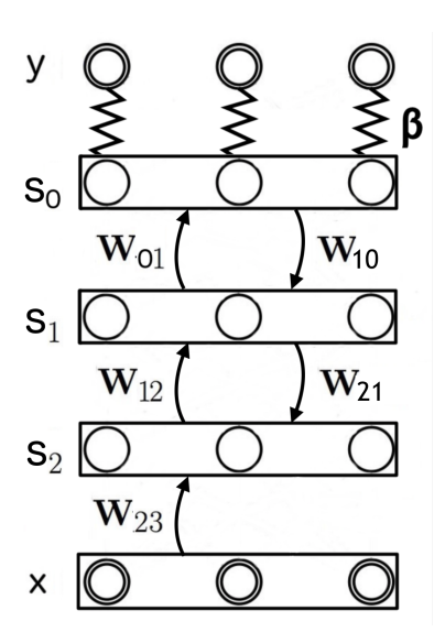 • 当 $\beta > 0$ 时,外部力 $-\beta \frac{\partial C}{\partial s}$ 会将输出层 $s_0$ 推向目标 $y$。系统收敛到新的不动点 $s_{\theta}^{\beta}$,满足 $\mu_{\theta}^{\beta}(\mathbf{x}, \mathbf{y}, s_{\theta}^{\beta}) = 0$。