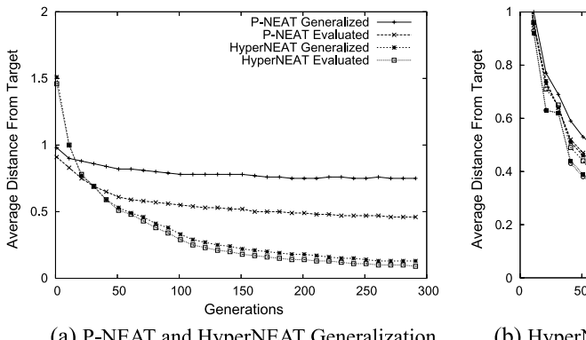 图 10 (a): HyperNEAT 在泛化测试中表现优异,而 PNEAT 表现较差。