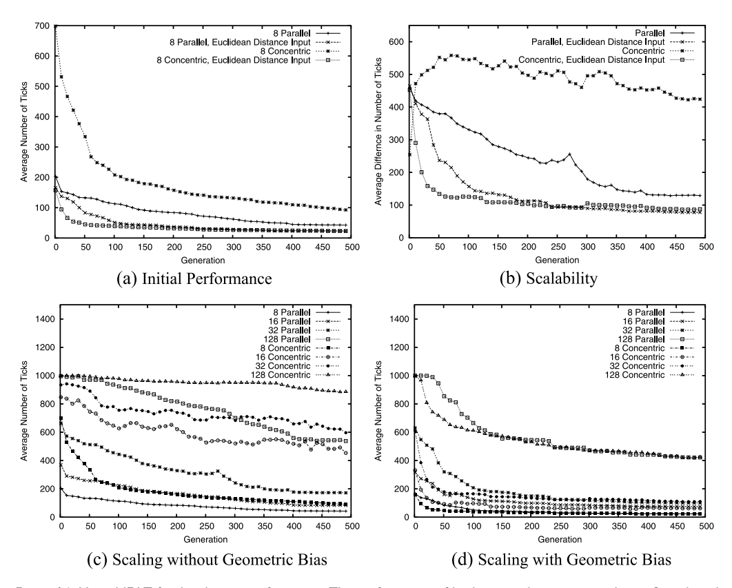 图 14: (a) 平行布局 (Parallel) 比同心布局 (Concentric) 学得快,但加入距离输入 (w/ dist) 后两者都变快且持平。