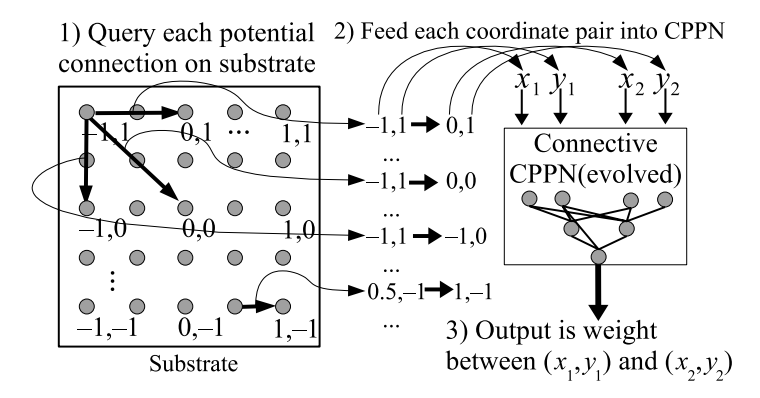 $$ w_{ij} = CPPN(x_i, y_i, x_j, y_j) $$
