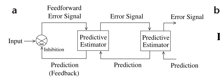 Fig. 1. Hierarchical network for predictive coding. (a) General architecture of the hierarchical predictive coding model. At each hierarchical level, feedback pathways carry predictions of neural activity at the lower level, whereas feedforward pathways carry residual errors between the predictions and actual neural activity. These errors are used by the predictive estimator (PE) at each level to correct its current estimate of the input signal and generate the next prediction. (b) Components of a PE module, composed of feedforward neurons encoding the synaptic weights UT, neurons whose responses r maintain the current estimate of the input signal, feedback neurons encoding U and conveying the prediction f(Ur) to the lower level, and error-detecting neurons computing the differ-