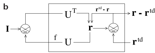 where $k_2$ is a positive parameter determining the learning rate of the network and $\mathbf{x} = \mathbf{Ur}$ . Note that this learning rule is a form of Hebbian adaptation, the presynaptic activity being $\mathbf{r}$ and the postsynaptic activity being the residual error $(\mathbf{I} - f(\mathbf{Ur}))$ (see Fig. 1b).