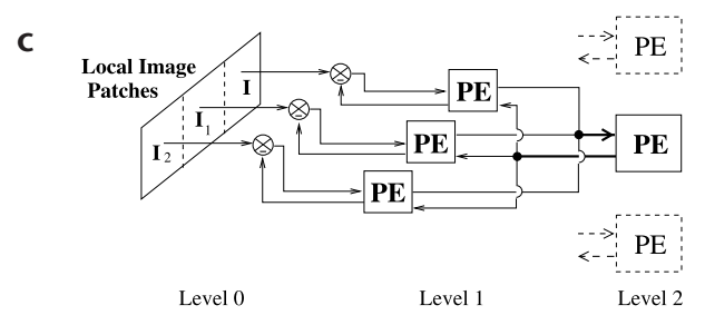 ence (r – rtd) between the current estimate r and its top-down prediction rtd from a higher level. (c) A three-level hierarchical network used in the simulations. An input image was analyzed by three level-1 PE modules, each predicting its own local image patch. The responses r of all three level-1 modules were input to the level-2 module. This convergence of lower-level inputs to a higher-level module increases receptivefield size of neurons as one ascends the hierarchy, with the receptive field at the highest level spanning the entire input image.