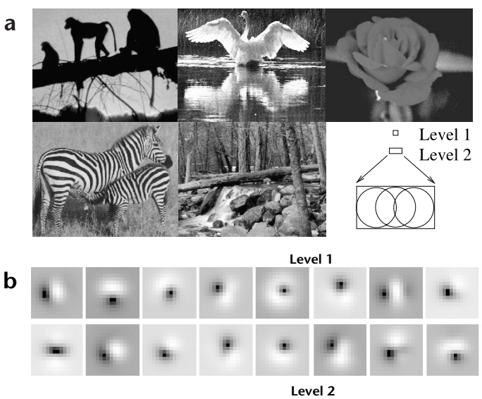 After exposure to several thousand natural image patches, the basis vectors learned by the network at level 1 resembled oriented edges or bars (Fig. 2b), whereas the basis vectors at level 2 seemed to be composed of various combinations of the features c