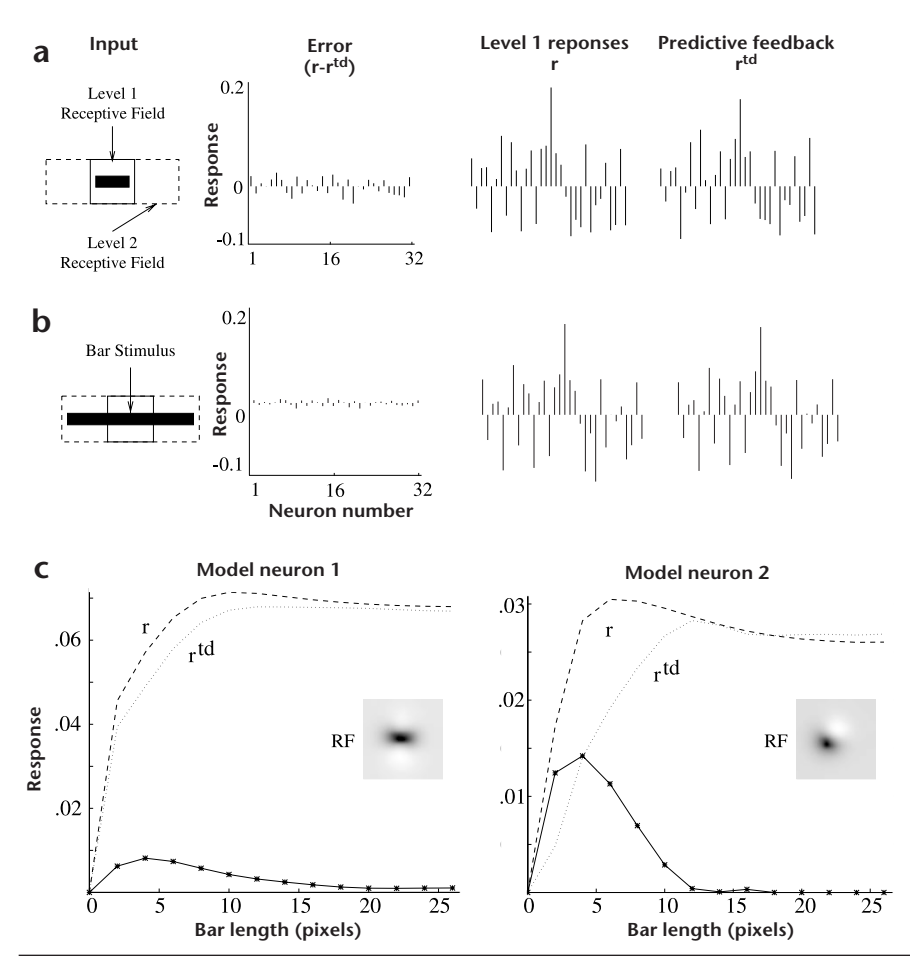 diction mechanisms. Without this contextual information in the surrounding region, the higher level cannot accurately predict the bar in the center. The short bar thus elicits a relatively large response from the error-detecting neurons as compared to the longer bar.