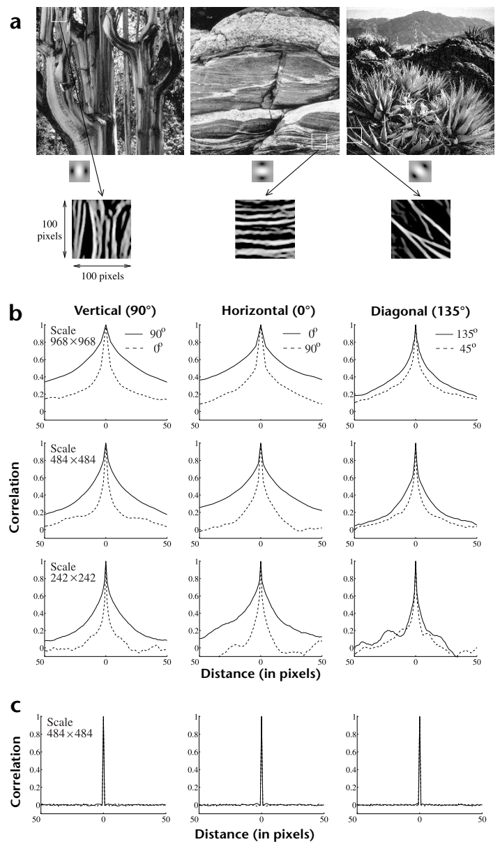 This argument suggests that the autocorrelation along a dominant orientation in a local region in natural images extends over reasonably large distances. We tested this hypothesis on a set of natural images (Fig. 4a). Random locations were selected in these images, and the local oriented energy was computed by summing the squared outputs of quadrature pairs of filters. The orientation that maximized this energy measure was selected as the dominant orientation. Correlations in the dominant orientation direction and in the opposite direction in the natural image were then calculated along three different orientation directions (vertical, horizontal and diagonal) for several thousand random image locations (Fig. 4b). The average correlations along the dominant directions, especially the vertical and horizontal directions, remain relatively high for distances of up to plus or minus 50 pixels as compared to the correlations in the opposite direction. As a control, we repeated the experiment for three different natural image sizes (968 × 968, 484 × 484 and 242 × 242 pixels). In all three cases, higher correlations were observed in the dominant direction as compared to the opposite direction. (Results for a random white-noise image are shown in Fig. 4c.)