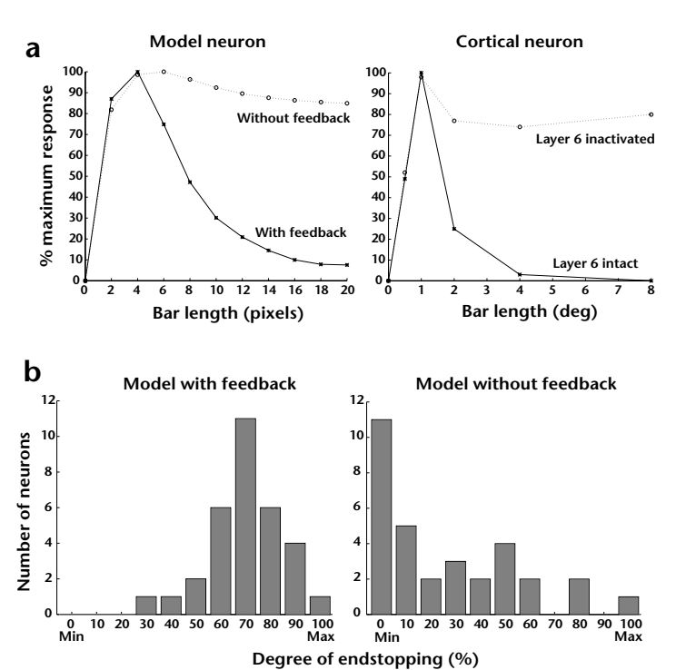 rons were classified into 10 categories according to their degree of endstopping, with 100% inhibition denoting a plateau response of zero to long bars. If we define endstopping as greater than 50% inhibition, 28 of the 32 model error-detecting neurons were endstopped with feedback intact. Disabling the feedback connections eliminated endstopping in all but 5 of these neurons, a reduction of 82%. The five neurons that continued to show some degree of endstopping after removal of feedback were those whose receptive field orientations were not completely aligned with that of the bar used for testing.