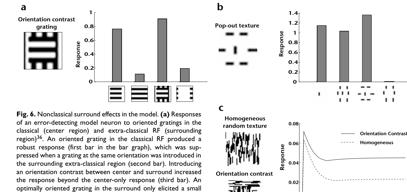 residual error signal due to better prediction from level 2 based on the surrounding context. Introducing an orientation contrast between the center and the surrounding region increased the model neuron response by 19.1% over the classical RF response, reflecting an increase in the residual error. Similar increases in neuronal responses due to cross-oriented grating stimuli have been reported in primary visual cortex36. An optimally oriented grating restricted only to the surround elicited little response in the model neuron. We determined the response of a model neuron (Fig. 6b) to four different texture stimuli previously used in a macaque V1 study35. The largest response was elicited by the 'pop-out' texture stimulus (compare with Fig. 4 of ref. 35 showing a similar response in a V1 neuron). For these stimuli, the spatial displacement of the central and surrounding bars in a particular direction sometimes modified a response from suppression to enhancement or vice versa, an effect attributable to the localized nature of the level-1 receptive fields (Fig. 2d). We also tested the response of an error-detecting model neuron