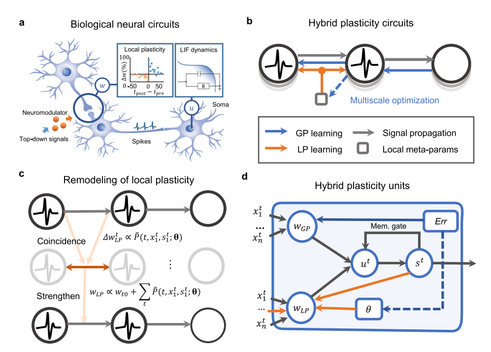 4. 权重分解: 突触权重 $w(t)$ 被分解为两部分:$w_{GP}$(由BP更新)和 $w_{LP}$(由元学习的脉冲LP更新)(图 1d)。