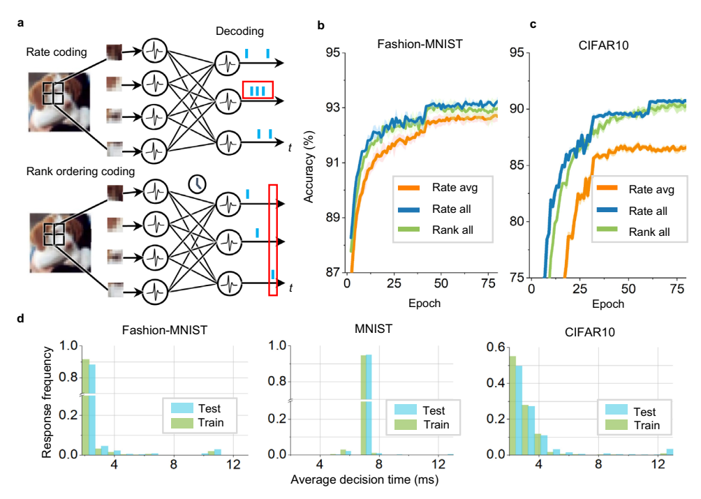图 2: 支持不同的编码方案。(a) 频率编码与时间排序编码。(b, c) 不同编码下的训练曲线。(d) 平均响应时间。