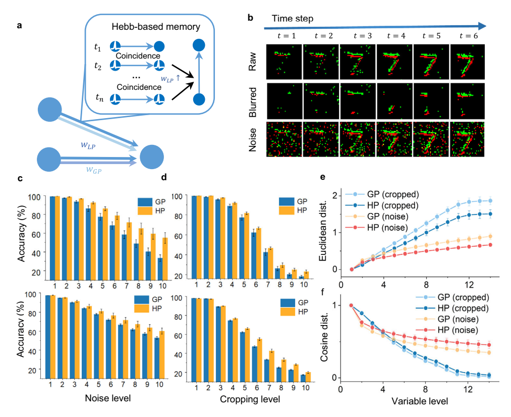 图 4: 混合可塑性提高容错能力。(a) 相关性局部模块的记忆功能。(b) 不完整数据的生成。(c, d) 裁剪和噪声实验的性能对比。(e, f) 隐层激活的距离分析。