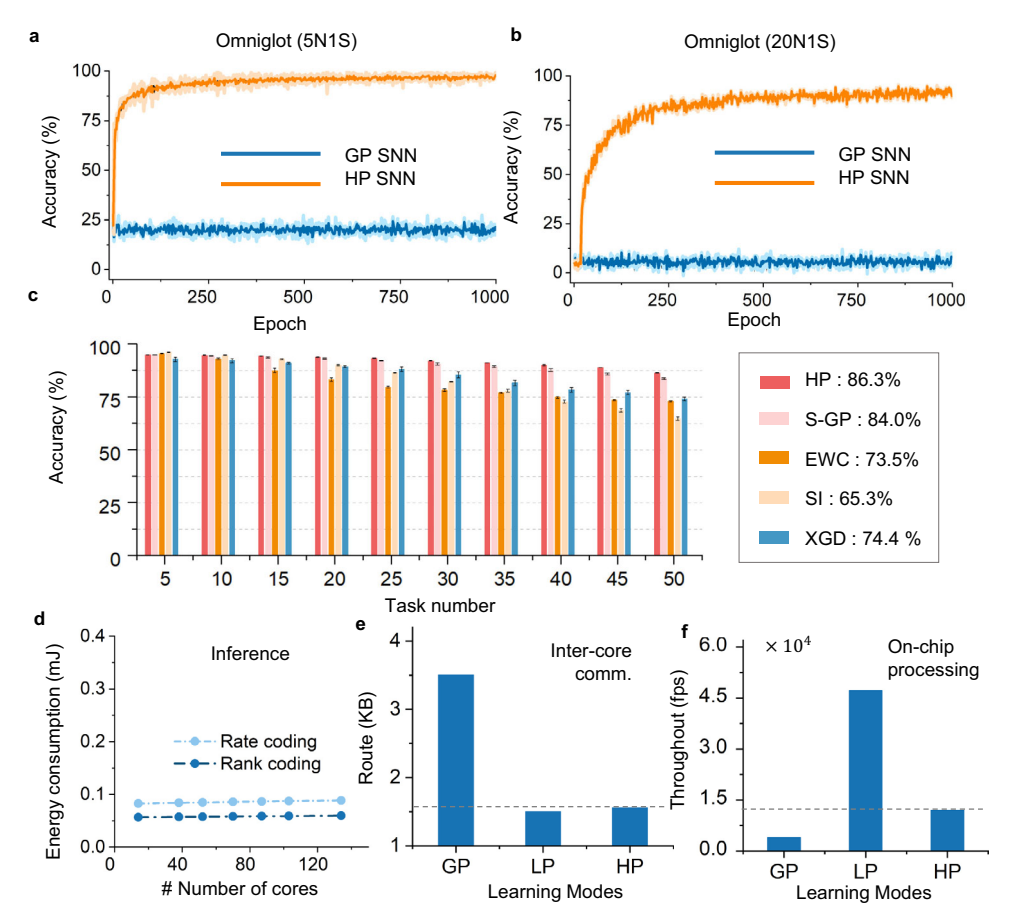 * 吞吐量与通信: 混合学习方案灵活分配 GP 和 LP。仅少量连接需要全局监督信号,显著减少了核间通信负载,利用众核架构实现高吞吐量(图 5e, f)。