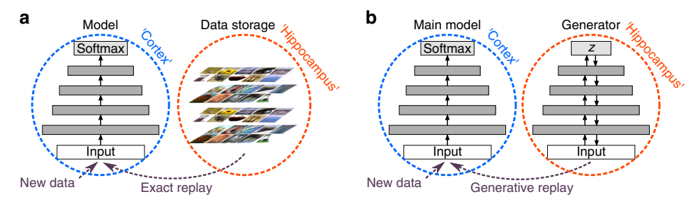 ANN 面临一个叫做灾难性遗忘的问题(英文叫Catastrophic Forgetting),也就是一个网络在被训练学习新的东西的时候,会迅速遗忘之前学习过的东西。在人脑中,目前认为通过象征这些记忆的神经元重激活来保护记忆。在ANN中,这种机制可以通过生成式重放来实现(英文名叫Generative Replay, GR),即训练一个生成模型来生成旧数据进行重放。