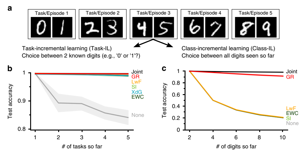 * 类增量学习 (Class-IL):测试时不知道任务ID(需要区分所有已学过的数字,例如10分类)。