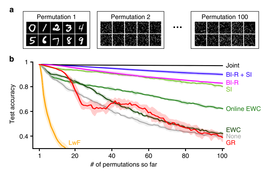 * Permuted MNIST: 全连接网络,2个隐藏层,每层2000个节点。