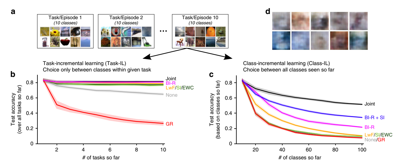 (b) Task-IL场景。(c) Class-IL场景。只有BI-R能在此场景下防止灾难性遗忘。