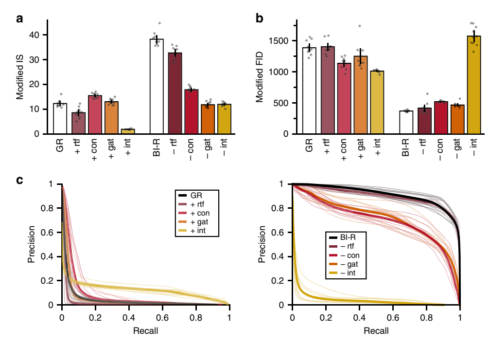 * BI-R 生成的样本(内部表示)在质量 (Precision) 和 多样性 (Recall) 上均显著优于标准 GR。
