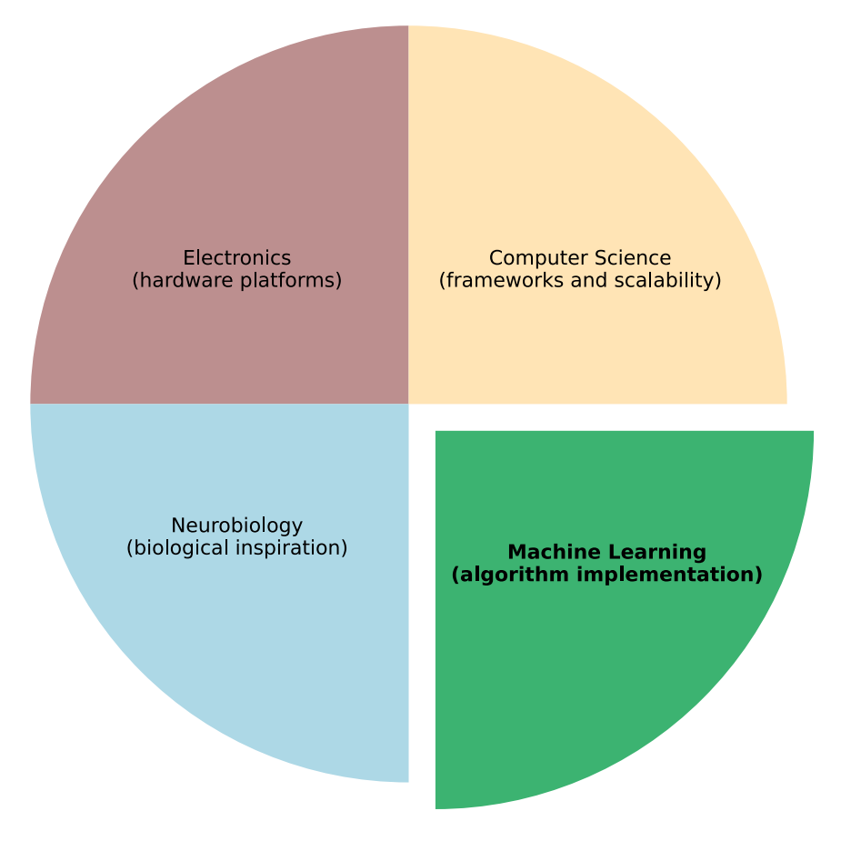 SNN research is a complex domain that operates at the intersection of electronics, computer science, neurobiology, and machine learning (ML), as illustrated in Figure 1. Each of these fields contributes essential foundational principles for SNN development: electronics enables the design of neuromorphic hardware, computer science provides programming frameworks and scalable implementations, and neurobiology introduces knowledge about principles of biological learning mechanisms, which ML implements and optimizes.