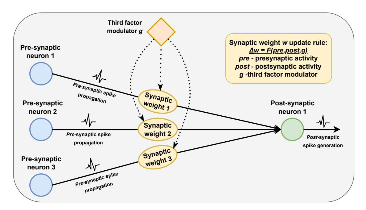 Figure 2. The general overview of the three-factor learning principle demonstrates how synaptic weights are modified based on local activity and the influence of a third factor