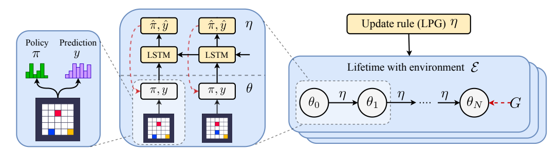 2. LPG Update Rule ($\eta$):这是一个元学习到的 LSTM 网络,它观察 Agent 的轨迹,并输出如何更新 Agent 的参数。