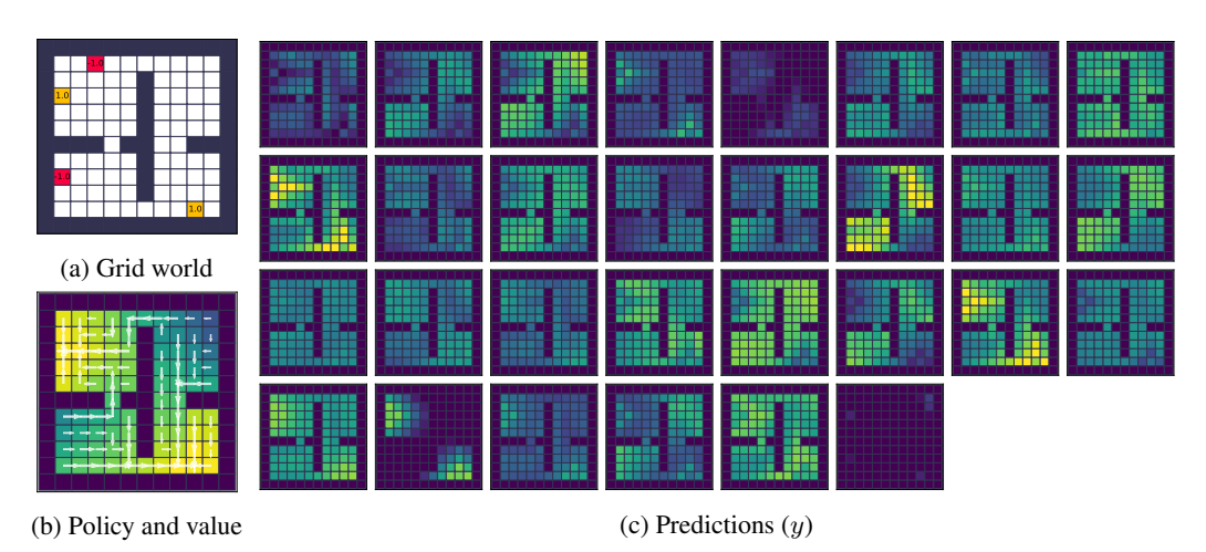图 4: 预测可视化。(c) 展示了 $y$ 向量在网格世界中的激活情况,可以看到它能够像价值函数一样在空间上传播奖励信号。