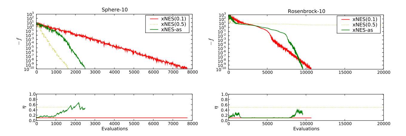 For any objective function f that requires locating an (approximately) quadratic optimum with some degree of precision (e.g. $f(\mathbf{z}) = \mathbf{z}^2$ ), $\sigma$ must decrease, which in turn increases the variance of the updates, as $\Delta \mu \propto \frac{1}{\sigma}$ and $\Delta \sigma \propto \frac{1}{\sigma}$ for a typical sample z. In fact, the updates become increasingly unstable, the smaller $\sigma$ becomes, an effect which a reduced learning rate or an increased population size can only delay but not avoid. Figure 1 illustrates this effect. Conversely, whenever $\sigma \gg 1$ is large, the magnitude of a typical update is severely reduced.