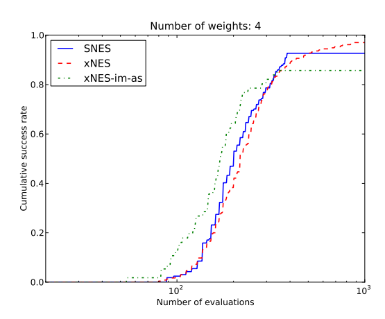 Table 2 summarizes the various techniques we introduced. The plain search gradient suffers from premature convergence and lack of scale invariance (see section 2.2). Therefore, we use the natural gradient instead, which turns NES into a viable optimization method. To improve performance and robustness, we introduced several novel techniques. Fitness shaping makes the NES algorithm invariant to order-preserving transformations of the fitness function, thus increasing robustness. Importance mixing reduces the number of necessary samples to estimate the search gradient, while adaptation sampling adjusts NES's learn-