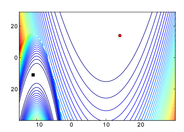 Figure 16: Left: Contour plot of (one instantiation of) the deceptive global optimization benchmark function $f_{rb}$ , in two dimensions. It is constructed to contain local optima in unit-cube-sized spaces, whose best value is uniformly random. In addition, it is superimposed on $10^d$ -sized regional plateaus, also with uniformly random value. Right: Value of the local optimum discovered on $f_{rb}$ (averaged over 250 runs, each with a budget of 100d function evaluations) as a function of problem dimension. Since the locally optimal values are uniformly distributed in [0,1], the results can equivalently be interpreted as the top percentile in which the found local optimum is located. E.g., on the 4-dimensional benchmark, NES with the Cauchy distribution tends to find one of the 6% best local optima, whereas employing the Gaussian distribution only leads to one of the best 22%.