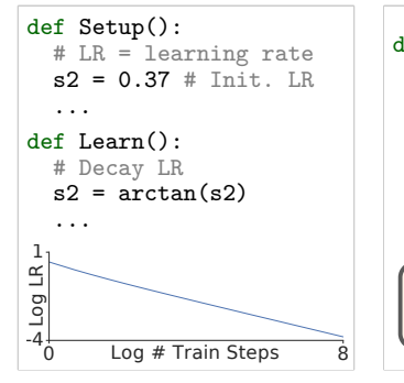 - (c) Once we have hypotheses about interesting code sections, we perform ablations/knock-outs, where we remove the code section from the algorithm to see if there is a significant loss in accuracy. As an example, for Section 4.2, we identified 6 interesting code sections in the best evolved algorithm to perform ablations. For each ablation, we removed the relevant code section, then tuned all the hyperparameters / constants again, and then computed the loss in validation accuracy. 4 out of the 6 ablations caused a large drop in accuracy. These are the ones that we discussed in Section 4.2. Namely, (1) the addition of noise to the input (−0.16%); (2) the bilinear model (−1.46%); (3) the normalized gradients (−1.20%); and (4) the weight averaging (−4.11%). The remaining 2 code sections show no significant loss upon ablation, and so were removed for code readability. Also for readability, we reorder some instructions when this makes no difference to the accuracy either (e.g. we move related code lines closer to each other). After this procedure, the code looks like that in Figure 6.