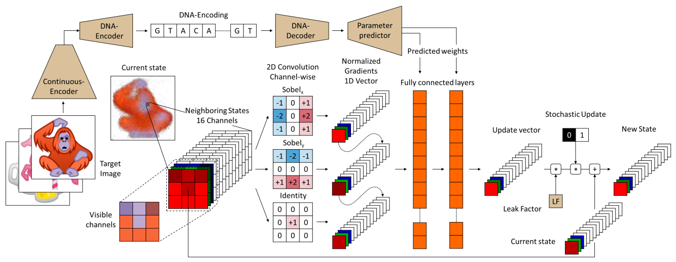 这篇论文的本质就是在原来的细胞自动机上面加了一个从图片到卷积参数的编码器,同时设计了一个不错的模型架构。说不上有多么的创新,但是可以学习一点他的方法和思想。