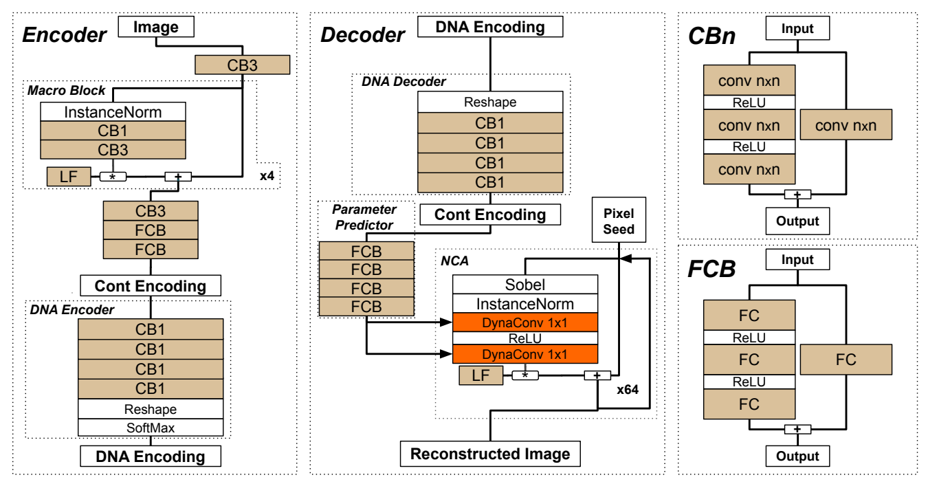 整体架构是一个端到端的 Auto-Encoder,但在解码端引入了 HyperNetwork (Parameter Predictor) 和 NCA。