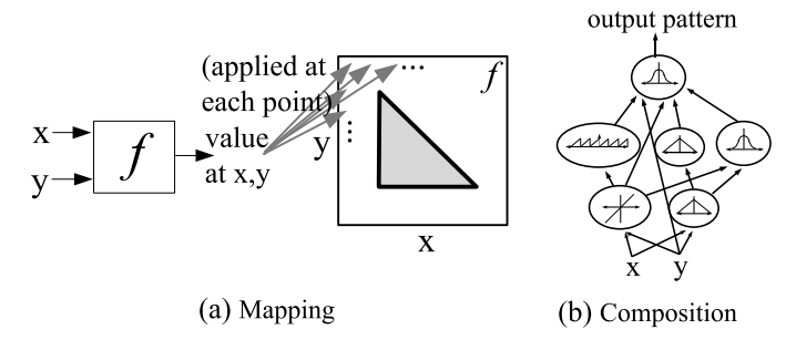 图 2: (a) 函数 $f$ 决定了二维空间中的图案。(b) CPPN 网络的结构决定了函数的组合方式。