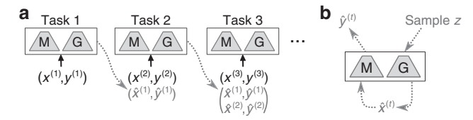 (a) 学习新任务时,主模型[M]和生成器[G]首先生成重放样本,与当前任务数据混合训练。