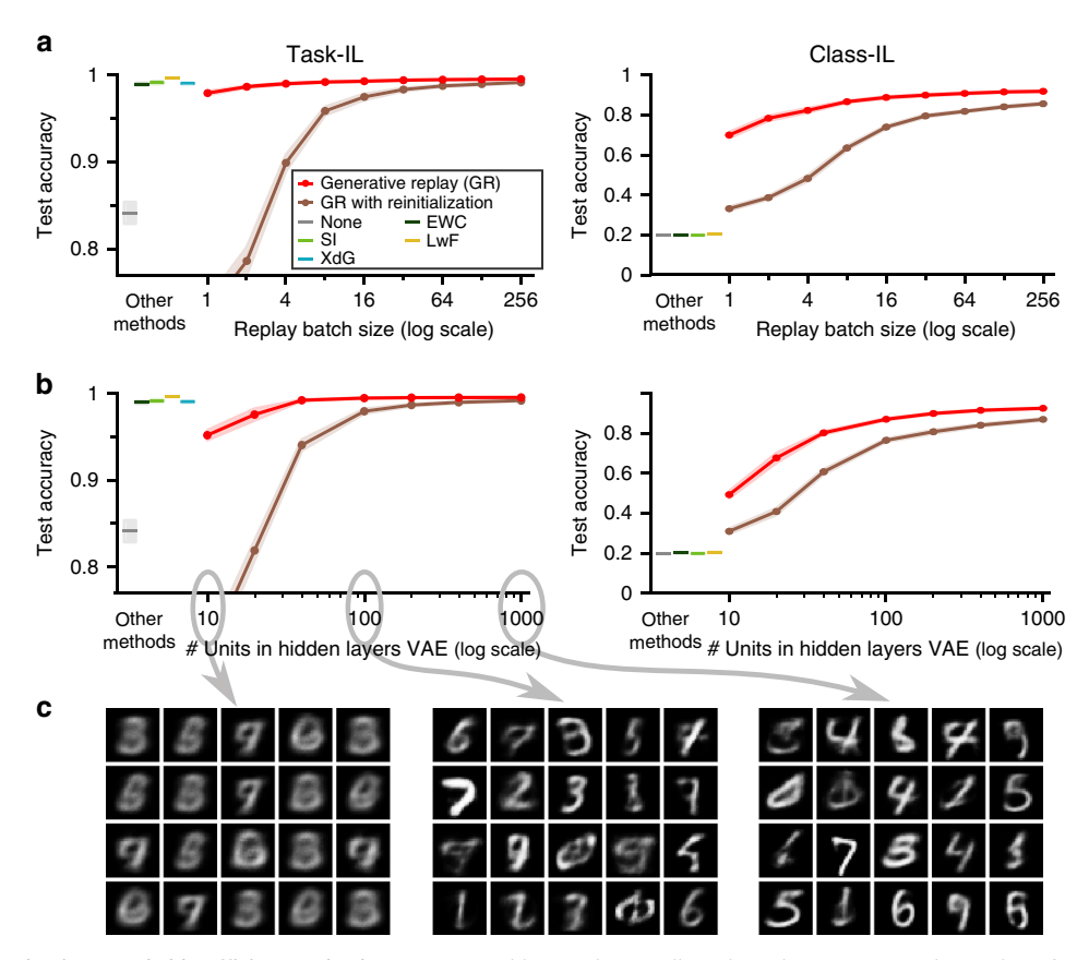 (a) 重放样本数量的影响。(b) VAE隐藏层单元数(质量)的影响。(c) 低质量重放样本示例。