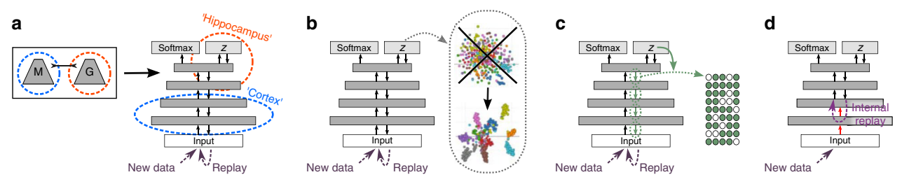 ANN 面临一个叫做灾难性遗忘的问题(英文叫Catastrophic Forgetting),也就是一个网络在被训练学习新的东西的时候,会迅速遗忘之前学习过的东西。在人脑中,目前认为通过象征这些记忆的神经元重激活来保护记忆。在ANN中,这种机制可以通过生成式重放来实现(英文名叫Generative Replay, GR),即训练一个生成模型来生成旧数据进行重放。