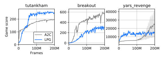 图 8: Atari 游戏上的学习曲线。LPG (蓝色) 在某些游戏上表现优于 A2C (橙色)。