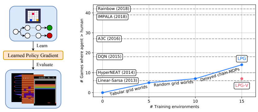 * 通用性:虽然仅在简单的玩具环境(Toy Environments)中进行元训练,LPG 能够泛化到复杂的 Atari 游戏中,并取得非凡的性能。