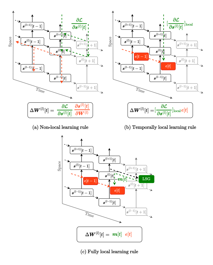 Fig. 1. Comparison of three learning rule strategies for training a recurrent model with state variable s[t]. (a) Non-local learning method (e.g., BPTT): Both spatial and temporal credit assignment problems are solved by propagating errors through time and space (layers). (b) Temporal local method: Temporal credit assignment is addressed using eligibility traces (e[t]), which are auxiliary variables that track the history of neural activity. These traces are modulated by a learning signal ([ ∂L ∂s(l)[t] ]local), which propagates errors across layers but not through time. (c) Fully local method (e.g., our proposed method TESS): In addition to eligibility traces, the learning signal (m[t]) is generated locally, addressing both spatial and temporal credit assignment entirely within the local context.