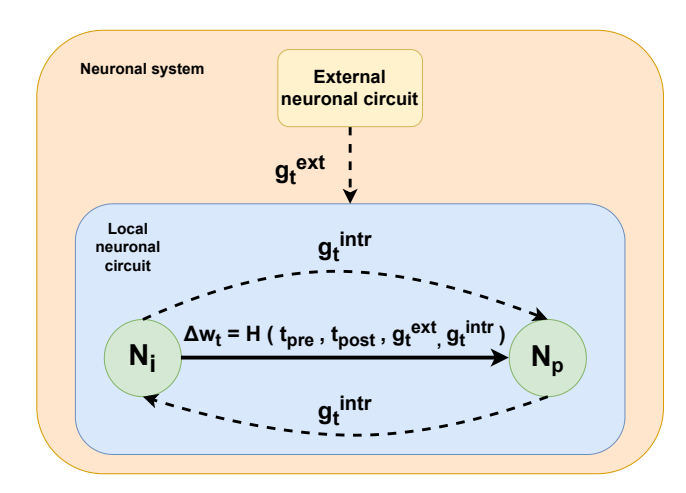 $$\Delta W_t = H(t_{pre}, t_{post}, g_t^{intr}, g_t^{ext})$$