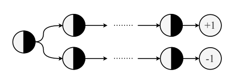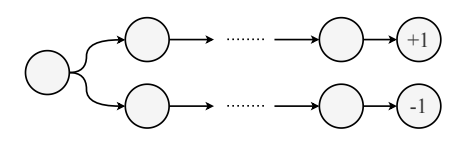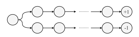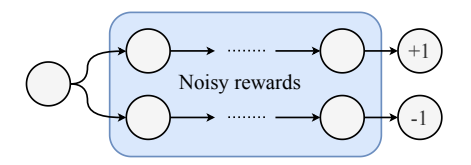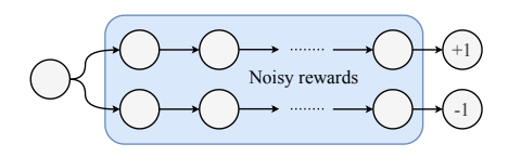 This environment is inspired by the Umbrella environment in Behaviour Suite [32]. The agent has a binary choice (a0, a1) for each time-step. The first action determines the reward at the end of the episode (1 or -1). The episode terminates after a fixed number of steps (i.e., chain length), which is sampled randomly from a pre-defined range for each lifetime and fixed within a lifetime. For each episode, we randomly determine which action leads to a positive reward and sample the corresponding chain MDP. There is no state aliasing because all states are distinct. Optionally, there can be noisy rewards {1, −1} for the states in the middle that are independent of the agent's action.