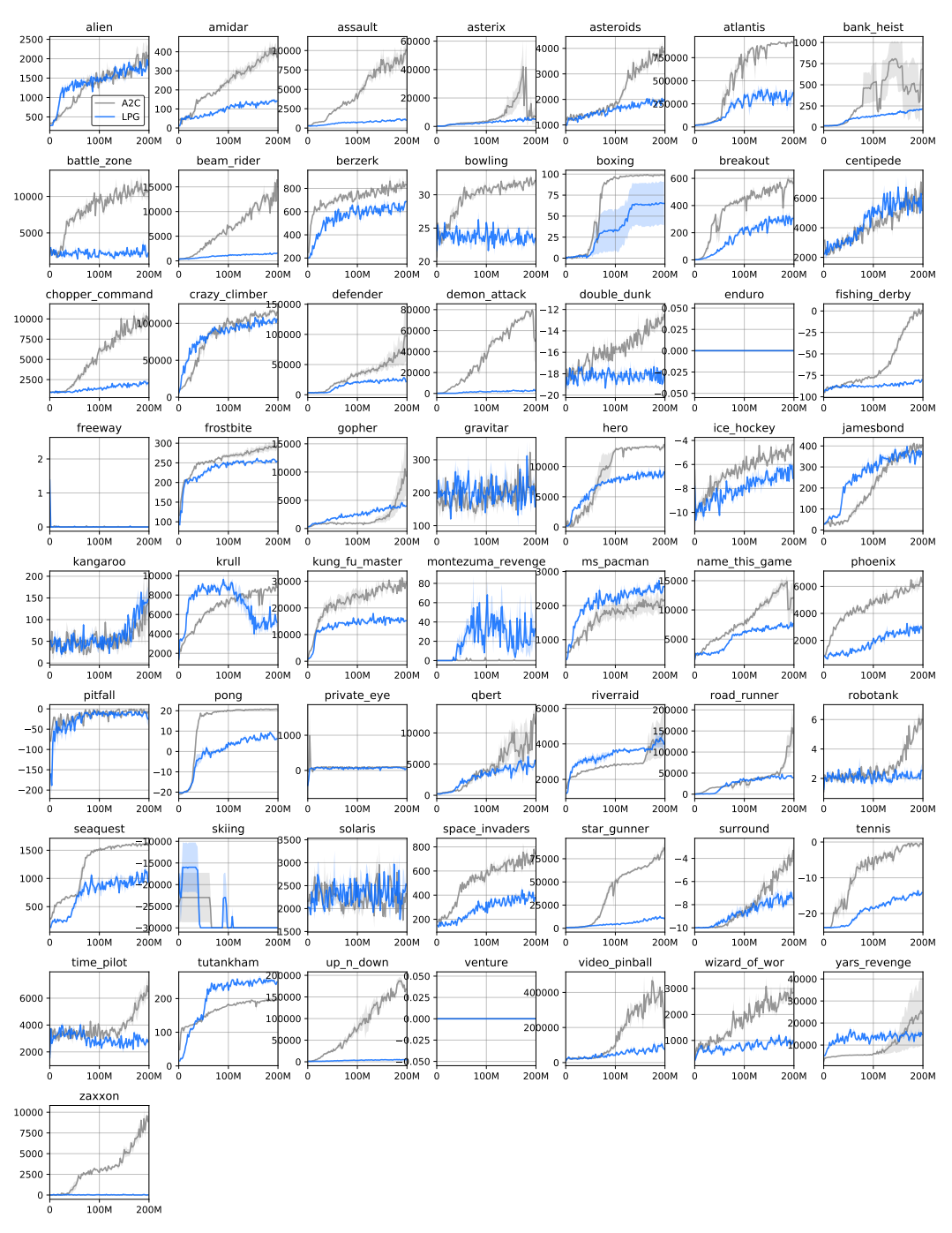 Baselines As discussed in Section 2 and Table 1, most of the prior work does not support generalisation across entirely different environments except MetaGenRL [23]. However, MetaGenRL is designed for continuous control and based on DDPG [37, 24]. Instead, to investigate the importance of discovering prediction semantics, we compare to our own baseline LPG-V, a variant of LPG that, like MetaGenRL, only learns a policy update rule (πˆ) given a value function trained by TD(λ) [39] without discovering its own prediction semantics.2 Additionally, we also compare against an advantage actor-critic (A2C) [29] as a canonical human-discovered algorithm baseline.