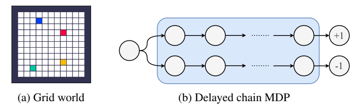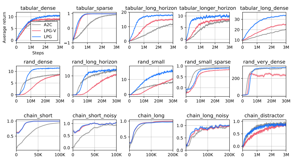 Training Environments For meta-training of LPG, we introduce three different kinds of toy domains as illustrated Figure 2. Tabular grid worlds are grid worlds with fixed object locations. Random grid worlds have randomised object locations for each episode. Delayed chain MDPs are simple MDPs with delayed rewards. There are 5 variations of environments for each domain with various number of rewarding states and episode lengths. The training environments are designed to captures basic RL challenges such as delayed reward, noisy reward, and long-term credit assignment. Most of the training environments are tabular without involving any function approximators. The details of all environments are described in the supplementary material.