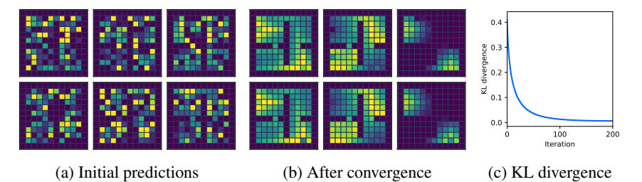 Figure 4: Visualisation of predictions. (a) A grid world with positive goals (yellow) and negative goals (red). (b) A near-optimal policy and its true values. (c) Visualisation of $y \in [0, 1]^{30}$ for the given policy in (b).