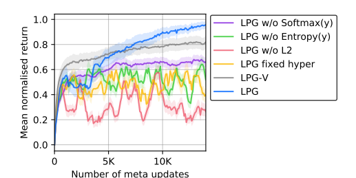 where H(·) is the entropy, and {βi} are meta-hyperparameters for each regularisation term. H(y) penalises too deterministic predictions, which shares the same motivation with policy entropy regularisation H(π) [29]. These are not applied to the agent but applied to the update rule so that the resulting LPG has such properties. The L2-regularisation for π, ˆ yˆ prevents the updates from being too aggressive. We discuss the effect of these regularisers in Section 4.4.