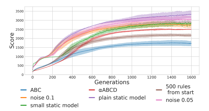 Figure 5: Training Results. For all models, we ran five independent evolutionary runs. The solid lines reflect the average population mean for a given model throughout evolution. The filled areas are the standard deviations of the models' population means. While the static models end up with better scores, all models, except 'ABC', are able to obtain reasonably well-performing populations within 1600 generations.