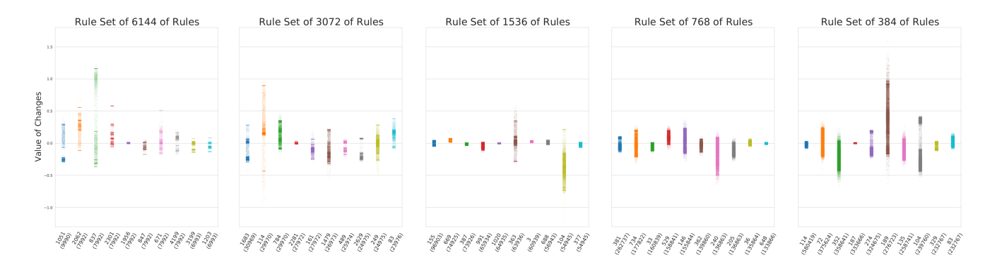 Figure 6: Evolved Rules Examples. Strip plots of values of connection weight changes of the top 10 most followed rules in an optimized version of each of the reduced rule sets. The names of each of the strips seen along the x-axis are the indices of the rules, and in parentheses are the number of updates that the rule made during an episode with the original environment settings. A strip indicates what updates was made by the rules during this episode.