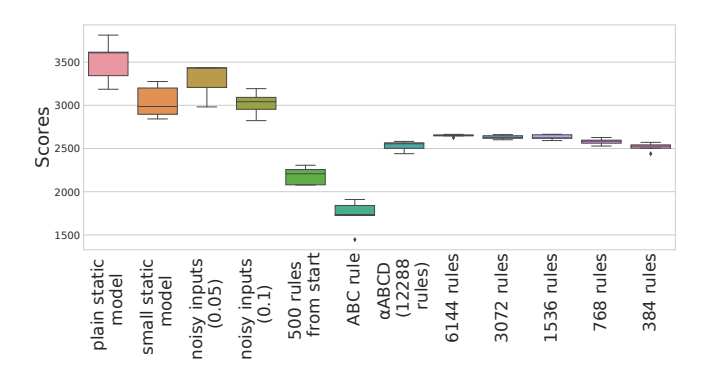 Figure 7: Original Environment Scores. Box plots for the scores of the optimized models in the original environment setting. For each model, the score is averaged over 100 independent episodes. As we optimized 5 models of each type, the box plots show the variation of the scores within a given model type. See Section 3.4 for model descriptions. All static models have better scores than any plastic model in the original setting. The reduced rule sets see no decrease in performance compared to the model with a rule for each connection.